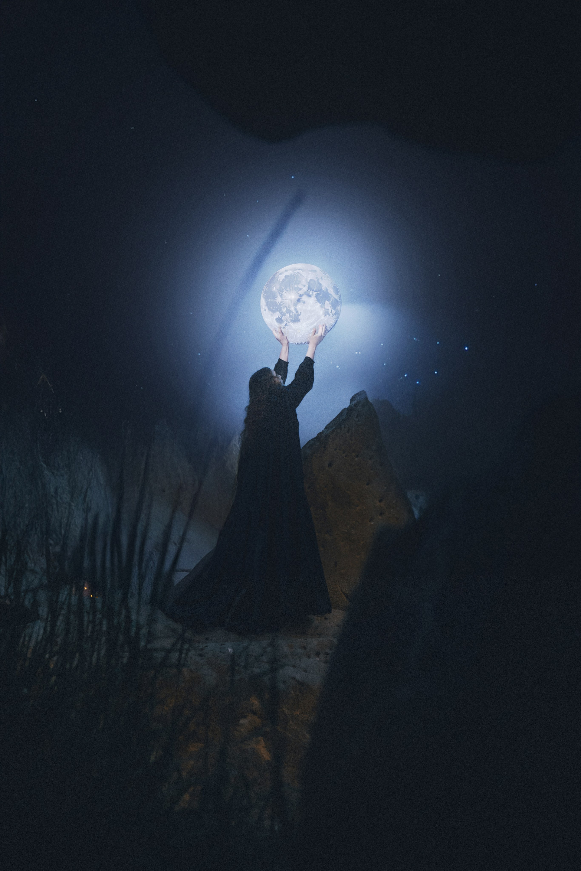 Однажды терпение лопнуло. Девушка вскинула руки к небу — не молитва, а приказ: «Хватит!» И случилось чудо: луна сорвалась с небосвода, упала в ее руки, легкая, как мотыльковое крыло. Теперь она носила её под плащем. Ночью вынимала — светила себе под нос, ровно и послушно. Мотыльки исчезли. Камень перестал дышать.